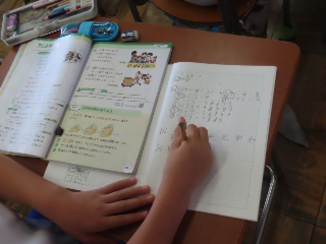 3年生が算数の学習をしていました。学習内容もほぼ終わり、今日は教科書の発展問題に取り組んでいました。