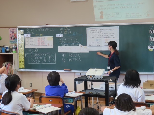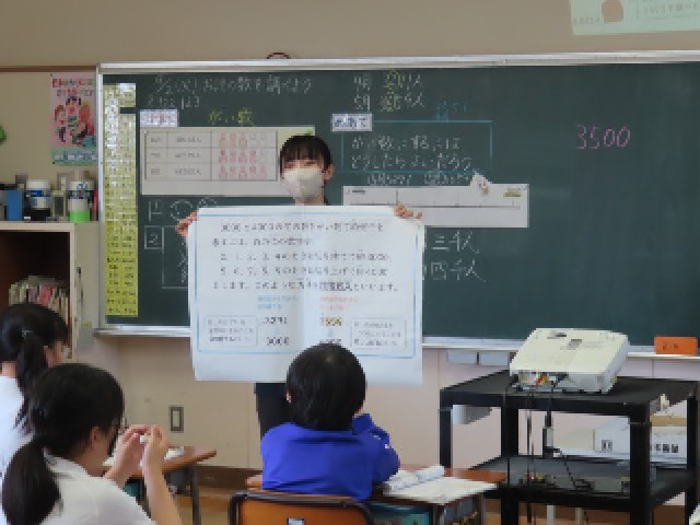 4年生の算数では、「およその数を調べよう」の学習に取り組んでいます。本日は「四捨五入」という言葉とその意味を学び、その仕組みについて理解を深めました。子どもたちは、数のくらいに注目しながら、どのようにしておよその数に直すのかを考え、意欲的に学習に取り組んでいました。