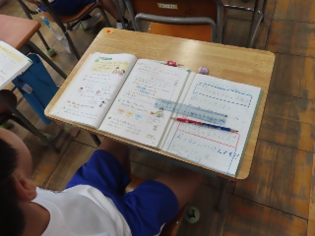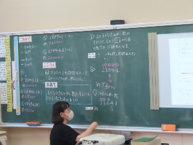 4年生の算数では、「およその数」を学習中です。今日は上から2けたの概数にするにはどうしたらよいか、子どもたちが自分の考えを出し合いながら学んでいました。