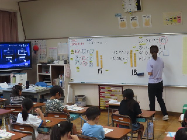 1年生の算数では、「10より大きい数」の学習に取り組んでいます。今日は、二けたの数について「10とあといくつになるか」を考えながら、数の仕組みに親しんでいました。