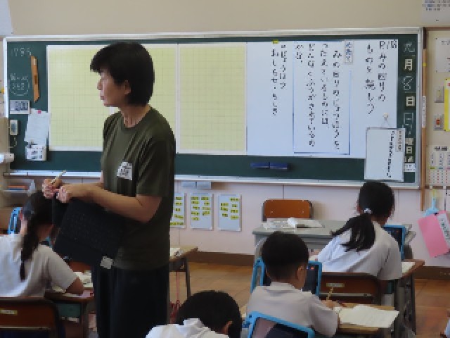 2年生の国語では、「身の回りのものを読もう」の学習に取り組んでいました。身の回りにある看板やポスターが、どのような工夫をして情報を伝えているのかについて、みんなで考えていました。子どもたちは、文字の大きさや色、イラストの使い方などに注目しながら、楽しく学習を進めていました。