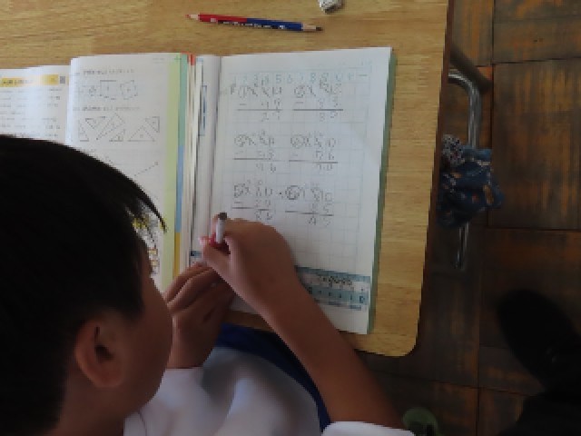 2年生の算数では、ひき算の筆算の学習を進めています。今日は、繰り下がりが2回ある計算にチャレンジしました。子どもたちは、位をそろえて丁寧に計算しながら、黙々と集中して問題に取り組んでいました。