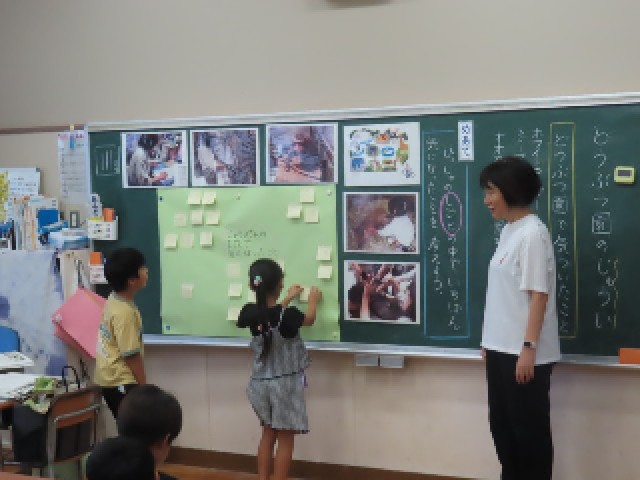 2年生の国語では、説明文「どうぶつ園のじゅうい」の学習を進めています。この単元では、「読んで考えたことを話そう」というめあてのもと、学びを深めていきます。今日は、獣医さんの仕事で気になったことを付箋に書き出し、みんなで共有していました。
