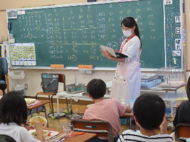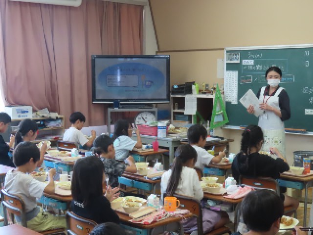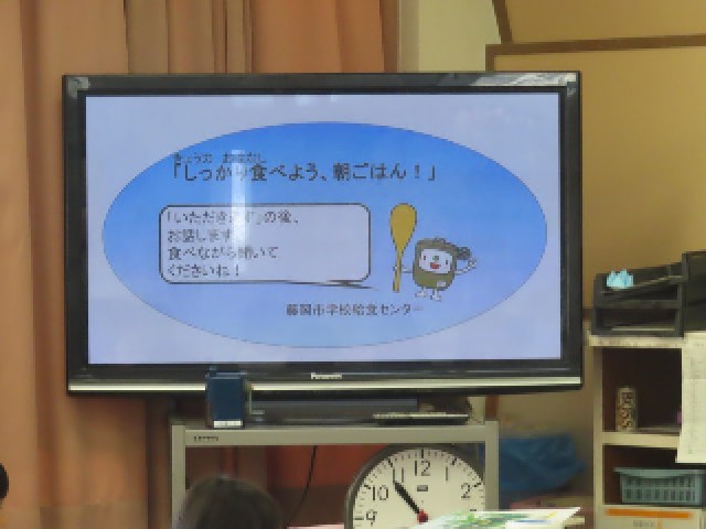 今日は、給食センターから栄養士さん2名が来校し、3年生の児童に向けて給食指導をしてくださいました。テーマは「朝食をしっかり食べよう」で、朝ごはんをとることの大切さや、体や頭の働きとの関係について、わかりやすく教えていただきました。