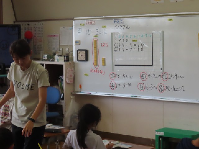 1年生の算数では、10より大きい数の学習をしています。今日は10より大きい数のひき算の学習を進めていました。これまでの学習を通して、少しずつ計算のしかたを理解し、今では多くの子どもたちが自信をもって計算できるようになってきました。