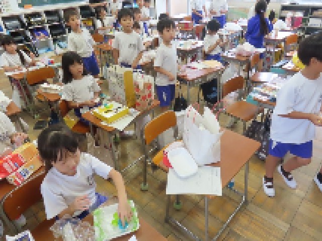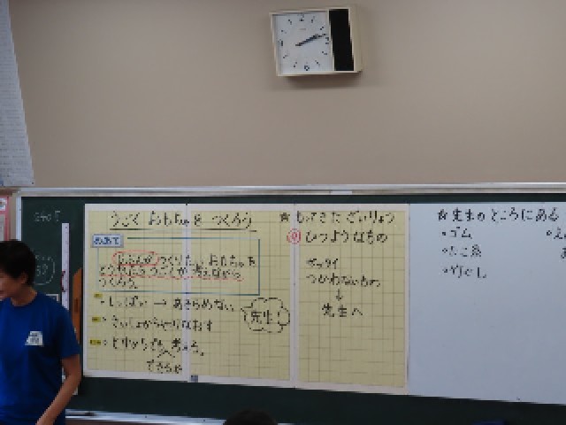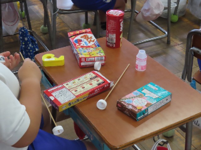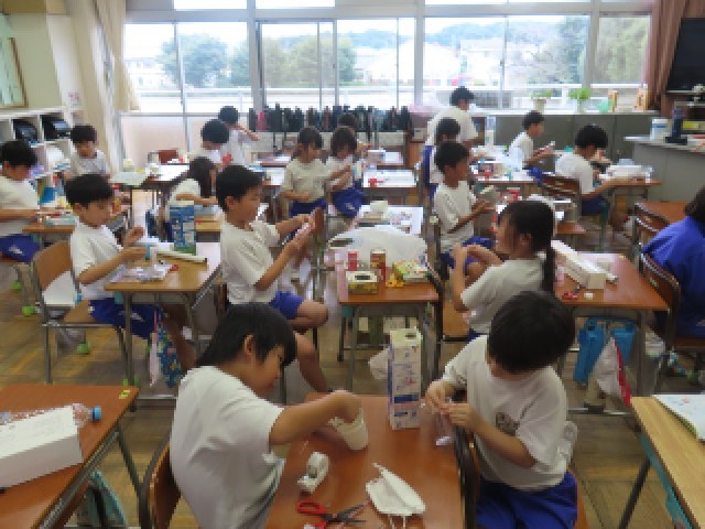 2年生が図工の時間に、「うごくおもちゃ」作りに取り組んでいました。身近な材料や道具を工夫して使いながら、思い思いの楽しいおもちゃを作っていました。完成したおもちゃを動かしてみて、笑顔を見せる子どもたちの姿がとても印象的でした。