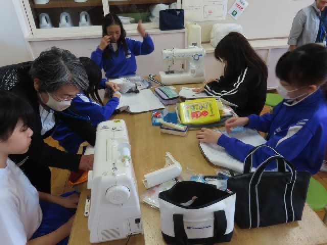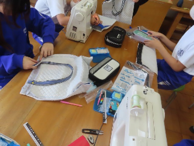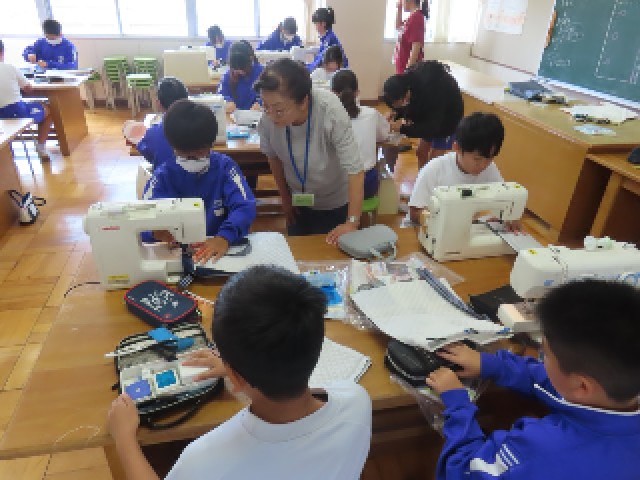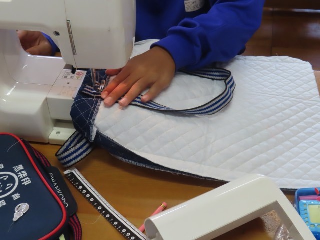 6年生の家庭科では、ミシンを使ってトートバッグ作りに取り組んでいます。作業もだいぶ進み、手提げの部分をつけている子も見られました。今日もボランティアの方々にお手伝いいただきました。ありがとうございました。