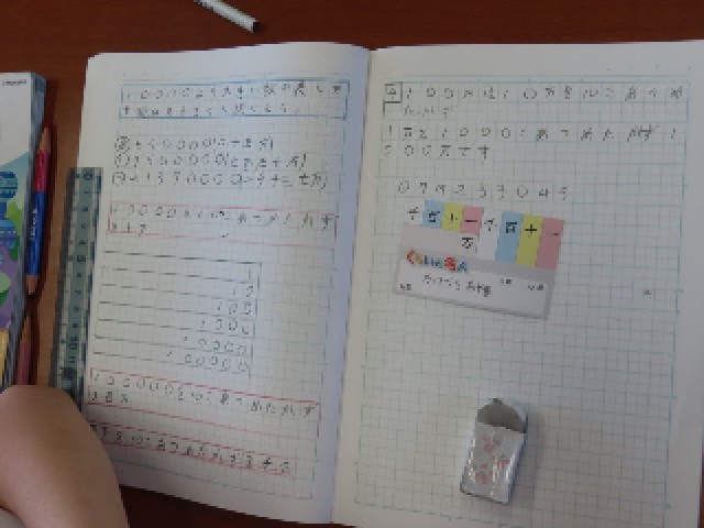 3年生の算数では、「10000より大きい数」の学習をしています。今日は、一千万までの位について学び、数の大きさを理解しました。さらに、その数を漢字で表記する練習も行いました。