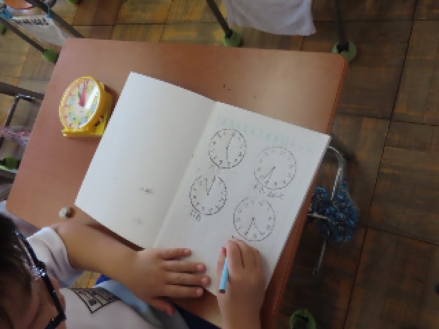 1年生の算数では、時計の読み方の学習に取り組んでいます。今日は時計の模型の針を自分の手で動かしながら、紙に描かれた時計の絵に、正しい針の位置を書き込んでいました。楽しみながら、時計の見方をしっかりと身につけている様子が見られました。