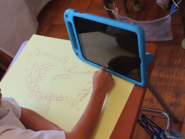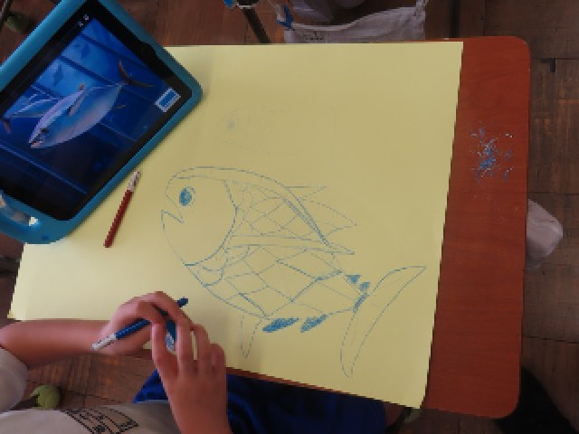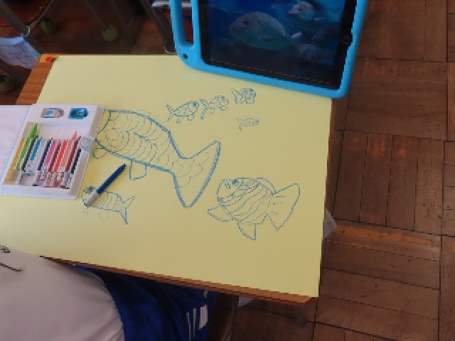 2年生の図工では、『にじいろのさかな』をテーマにした絵画の制作に取り組んでいます。今日は「さかなの絵を完成させよう」というめあてのもと、一人ひとりが思い思いのさかなの姿を、工夫しながら丁寧に描いていました