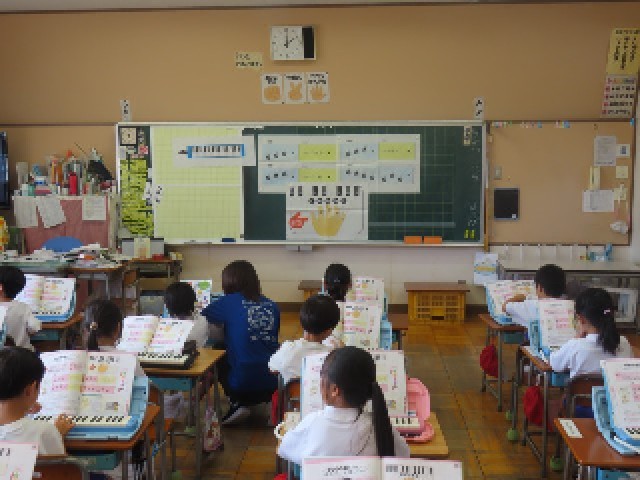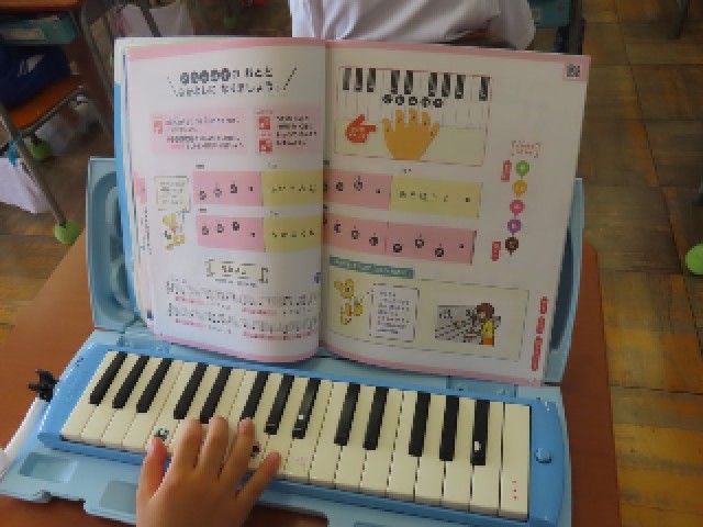 1年生の音楽では、鍵盤ハーモニカの演奏練習に取り組んでいます。今日は「なかよし」の曲を、楽器の音と歌声を合わせて演奏していました。リズムに合わせて一生懸命演奏する姿から、音楽を楽しむ気持ちが伝わってきました。