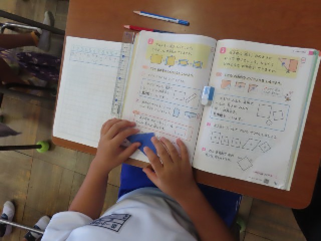 2年生の算数では、「三角形と四角形」について学習しています。今日は折り紙を使い、切ってできた四角形を観察しながら、四角形の特徴について学びました。