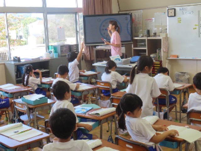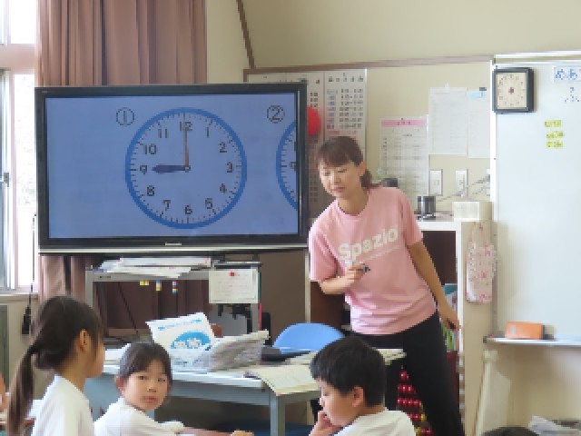 1年生が算数の学習に取り組んでいました。今日は「とけいの読み方」の復習を行い、みんなでたくさんの問題を解いていました。