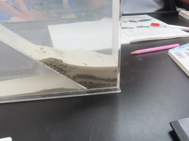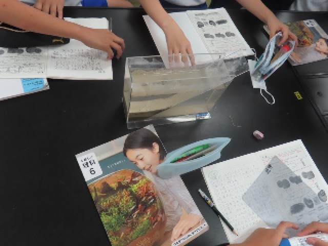 6年生が理科の学習に取り組んでいました。今日は、昨日行った「地層をつくる実験」の結果を観察しながら、班の仲間と一緒にその理由や気づいたことについて考察をまとめていました。意見を出し合いながら、真剣に話し合う姿が印象的でした。