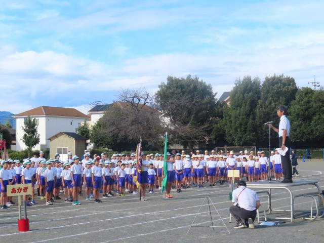今朝の業前活動では、体育集会が行われました。内容は、運動会の開会式の流れを確認する練習でした。澄んだ秋空のもと、子どもたちは気持ちよく活動に取り組んでいました。
