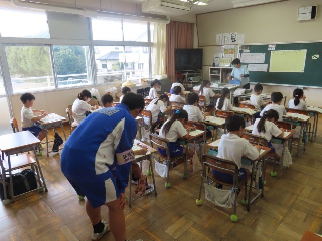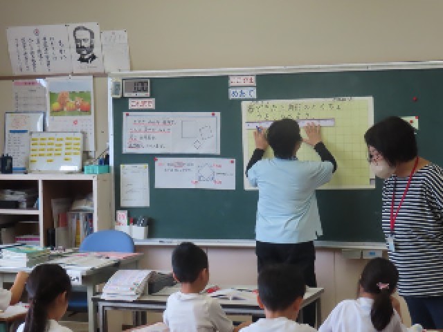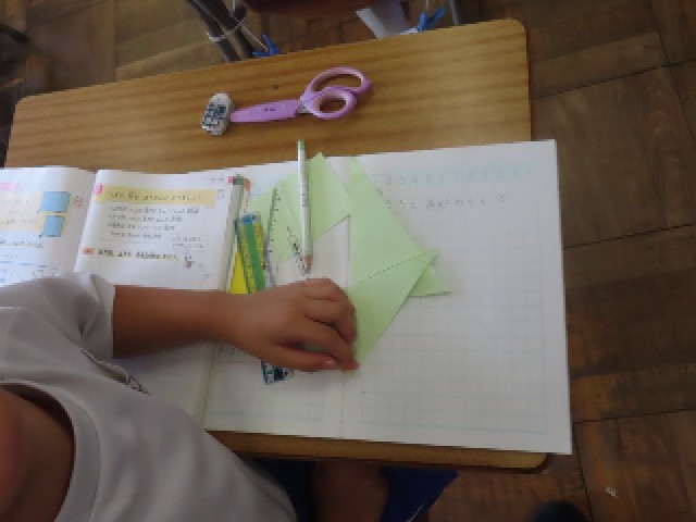 2年生の算数では、「三角形と四角形」の学習を進めています。今日は、紙を切ってできた三角形を使いながら、その形の特徴について考えました。子どもたちは、辺の長さや角の大きさに注目しながら、楽しそうに学習に取り組んでいました。今日からチャレンジウィークで来校している東中生も一緒に教えてくれています。