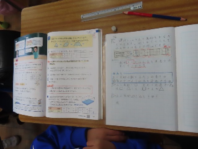 4年生の算数では、「変わり方」の学習を進めています。今日は、「正三角形の数とまわりの長さの関係は、どのような式で表せるのか」というめあてのもと、学習に取り組んでいました。子どもたちは、図を見ながら数の増え方に注目し、関係性を見つけようと一生懸命考えていました。