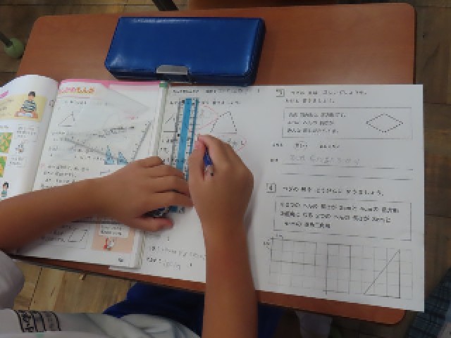 2年生の算数では、「三角形と四角形」の学習を進めています。この単元もいよいよまとめの段階に入り、今日はプリントを使ってこれまでの内容を復習していました。子どもたちは、形の特徴を思い出しながら、一つひとつの問題に丁寧に取り組んでいました。