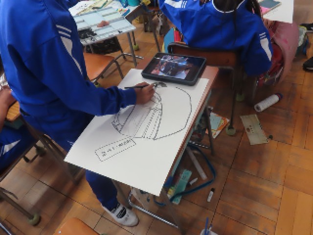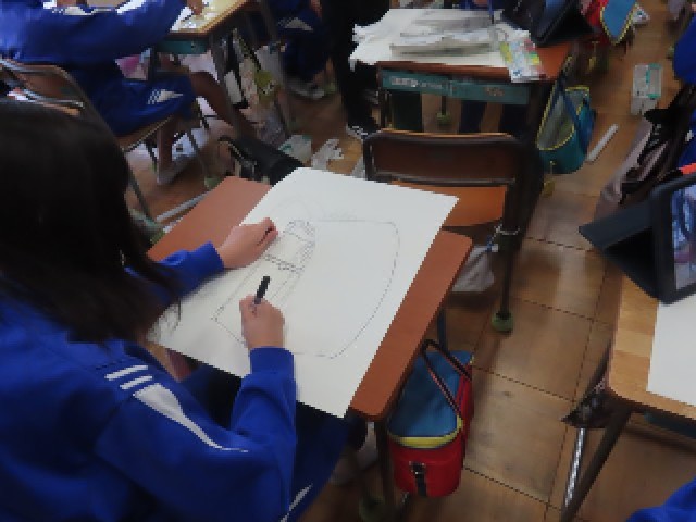 6年生は図工の時間に、「絵を描く会」に向けてランドセルの絵を描いています。それぞれが思い出の詰まったランドセルを丁寧に描き進めており、多くの児童が下描きを終えて、色塗りに入っていました。完成に向けて、一人ひとりが集中して取り組んでいます。