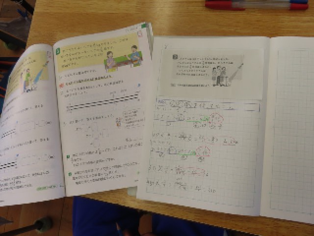 6年生の算数では、「分数のわり算」の学習を進めています。今日は文章問題を使って、比べる量を求める学習に取り組みました。子どもたちは問題の意味を考えながら、自分の考えをノートにまとめていました。