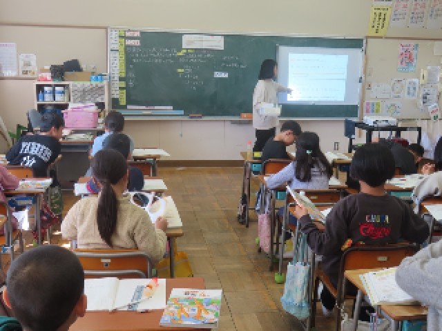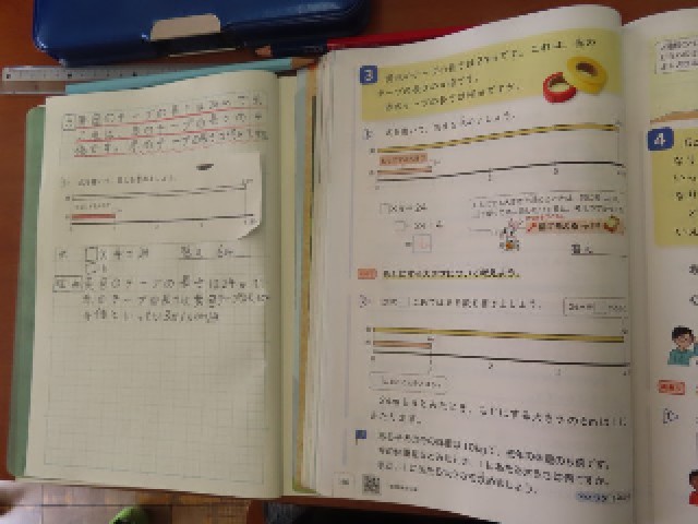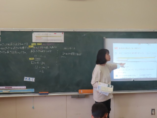 4年生の算数では、「倍の計算を考えよう」の学習を進めています。24mの黄色のテープが赤のテープの4倍の長さであるとき、赤のテープの長さをどのように求めればよいかを考えました。子どもたちは、図を使ったり式を立てたりしながら、自分の考えを友達と伝え合っていました。