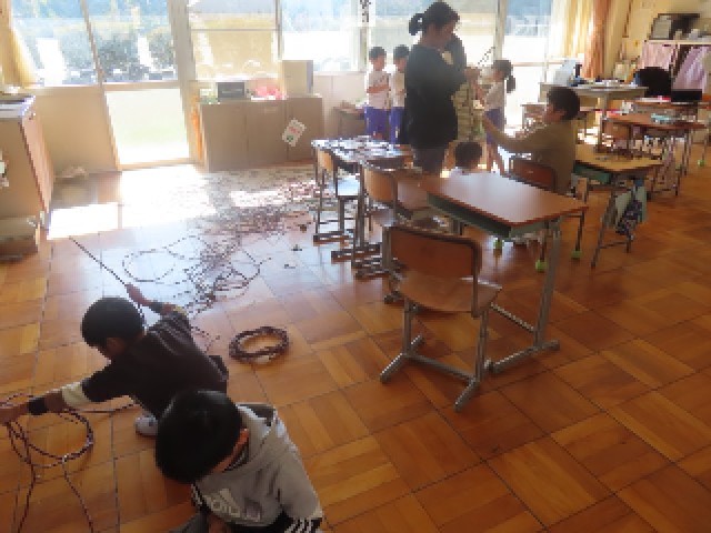 わかくさ学級の子どもたちは、さつまいものつるを使ってリース作りをしていました。上級生が下級生に作り方を教えてあげる様子も見られました。飾り付けはこれからですが、どんなリースになるのか楽しみです。