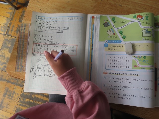3年生は算数で「長さ」の学習をしています。今日は、「きょり」と「道のり」の違いを確認しながら学習を進めました。子どもたちは、それぞれの言葉の意味や使い方を考えたり、友達と意見を交換したりしながら理解を深めていました。