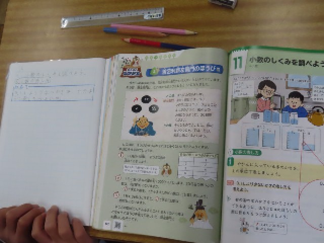 4年生の算数では、「小数」の学習が始まりました。これから、小数第一位よりも小さい数の意味や表し方について学習を進めていきます。今日は、最初に小数のしくみについて考えたり、例を使って確かめたりしながら、みんなで理解を深めていました。