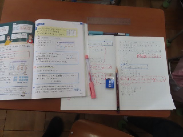 6年生の算数では、「比」の学習をしていました。この日のめあては「比の値をしらべよう」です。子どもたちは、比の値を調べながら、同じ比を表すときには比の大きさが等しくなることを学んでいました。