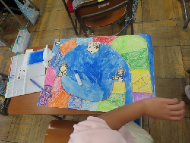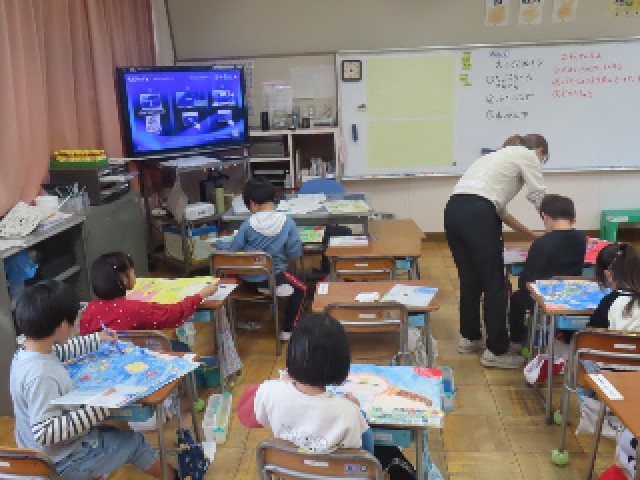1年生の図工では、絵を描く会に向けた絵画制作に取り組んでいました。作業も最終段階に入り、色塗りを終えて作品を完成させる児童も見られました。児童は、一人ひとりの工夫を生かしながら、制作に熱心に取り組んでいました。