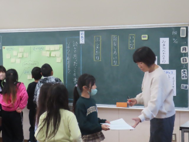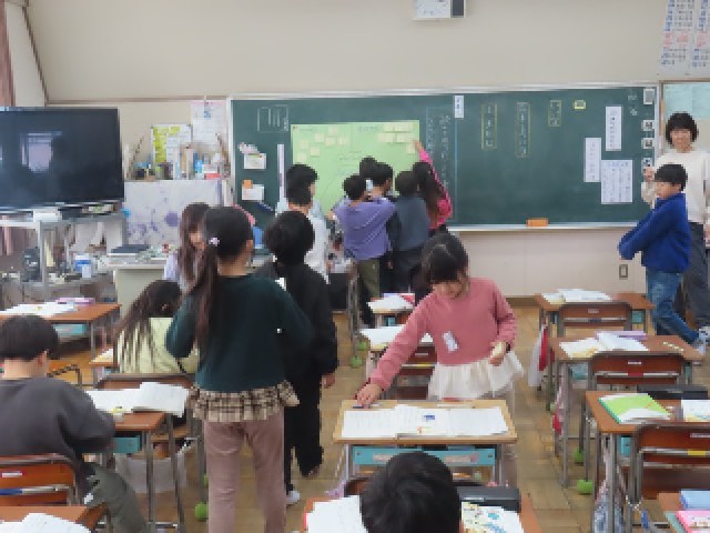 2年生の国語では、物語文「みきのたからもの」の学習をしていました。「読んで思ったことを書こう」というめあてで学習を進め、子どもたちは付箋紙に自分の感じたことを書いて貼り、友達と意見を交流していました。それぞれの感じ方を伝え合う中で、物語の世界をより深く味わっている様子が見られました。