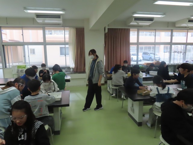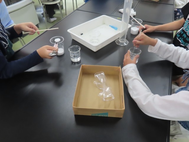 5年生は理科で「もののとけ方」の学習に取り組んでいます。本日は「物が水に溶けるには限りがあるのだろうか」というめあてのもと、食塩とミョウバンを使って実験を行いました。児童たちは、溶け方の違いを観察しながら、結果を比べたり考察したりして、意欲的に学習を進めていました。