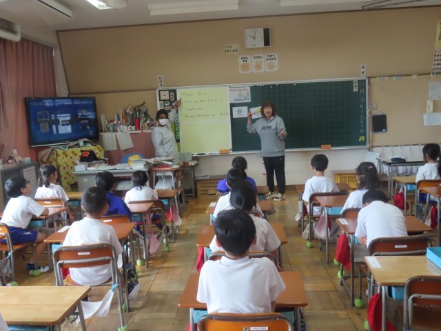 1年生が外国語活動の学習に取り組んでいました。今日は、ALTの先生と一緒に「Here you are 」や「Thank you」のようなあいさつの英語表現を練習しました。子どもたちは笑顔で声に出しながら、楽しんで学んでいる様子が見られました。日常生活でも積極的に使ってほしいと思います。