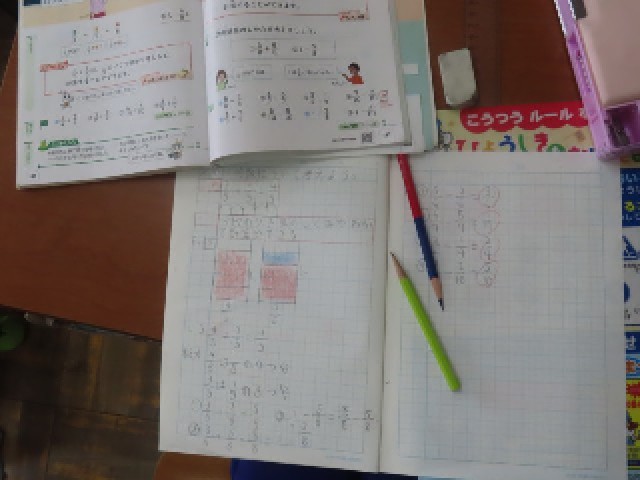 3年生の算数では「分数」の学習を進めています。今日は、分数のひき算の考え方をみんなで確認し、その後は練習問題に取り組みながら計算の仕方を確かめていました。教室では、一生懸命に問題に向き合う姿が見られました。