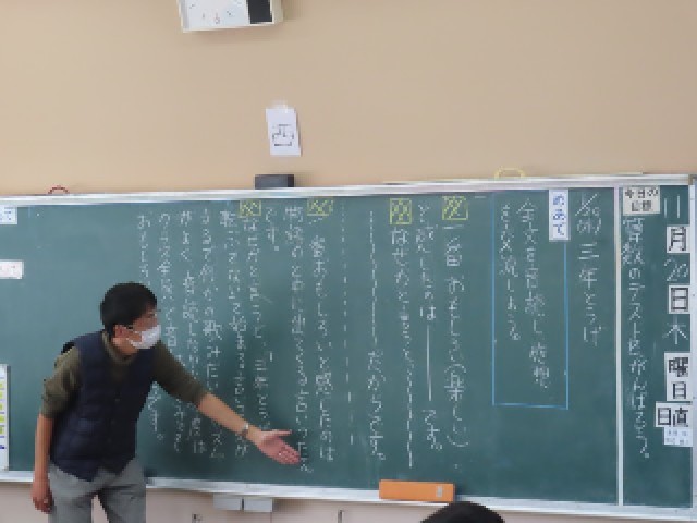 3年生の国語では、物語文「三年とうげ」の学習に入りました。今日は「全文を読み、感想を交流しよう」をめあてに活動していました。子どもたちは登場人物の気持ちやお話の不思議さなど、感じたことを楽しそうに伝え合っていました。これからの学習も、意欲的に取り組んでほしいと思います。