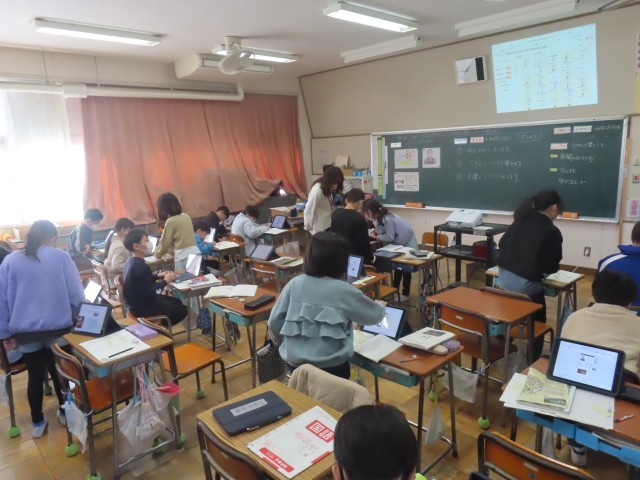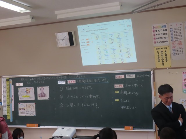 4年生は社会科で郷土学習のまとめとして、各自で新聞を作成しました。今日は完成した新聞を互いに見合い、工夫されているところや感心したことを付箋に書きながら、友達と意見を交換していました。子どもたちは互いの作品に触発されながら、学びを深める様子が見られました。