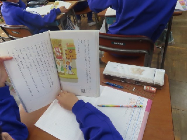 3年生の国語では、物語文「三年とうげ」の学習を進めています。今日は、単元のめあてをみんなで確認したあと、文章の範読を静かに聞き、物語の内容をつかんでいました。