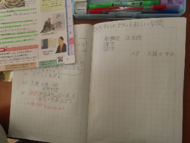6年生は社会で歴史の学習を進めています。時代は江戸時代に入り、今日は江戸時代の文化や学問について学びました。子どもたちは、当時の人々の暮らしや学びの工夫に興味を持ちながら、意欲的に学習に取り組んでいました。
