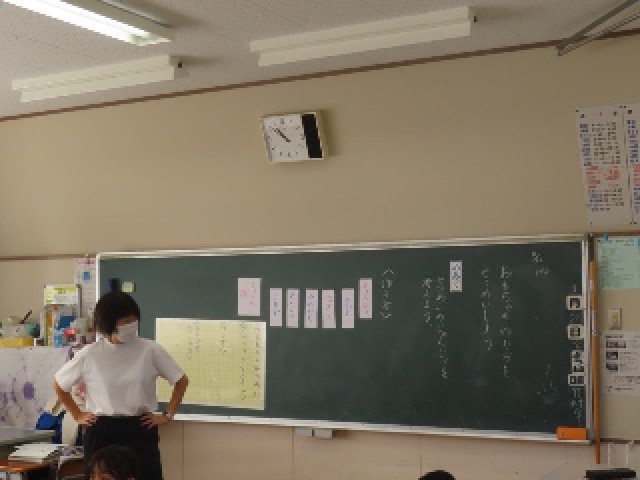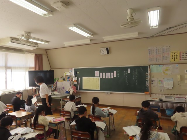 2年生の国語では、「おもちゃの作り方をせつめいしよう」の学習に取り組んでいました。子どもたちは、つなぎことばを上手に使いながら、作る手順がわかるように順を追って説明する文章を考えていました。