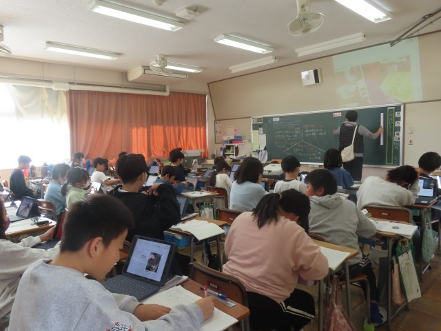 5年生の社会では、「これからの工業生産とわたしたち」の学習に取り組んでいました。今日は「日本のものづくりのひみつ」について調べ、資料や図を見ながら日本の工業生産の特徴や工夫について理解を深めていました。