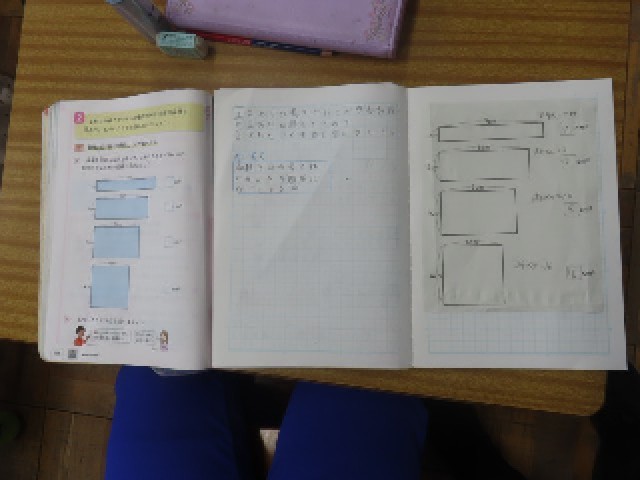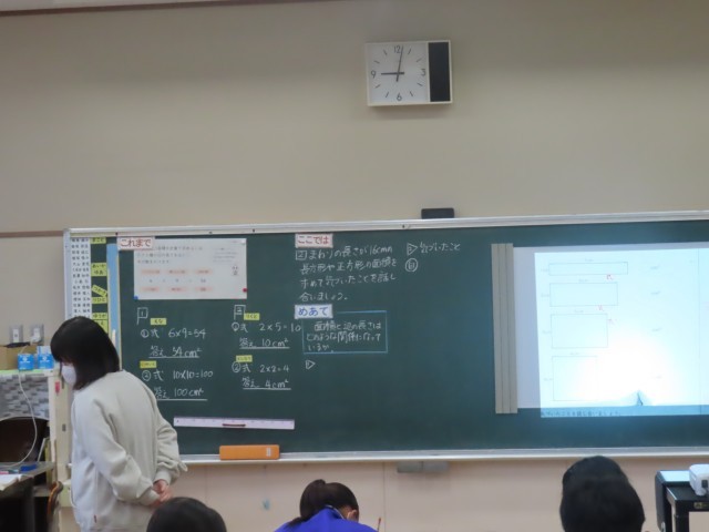4年生は算数で「面積」の学習に取り組んでいます。今日は、長方形の周りの長さと面積の関係について、自分たちで考えながら調べました。形を変えても面積が同じ場合や周りの長さの違いに気づきながら、楽しそうに学習していました。