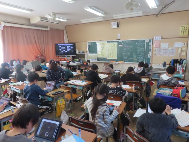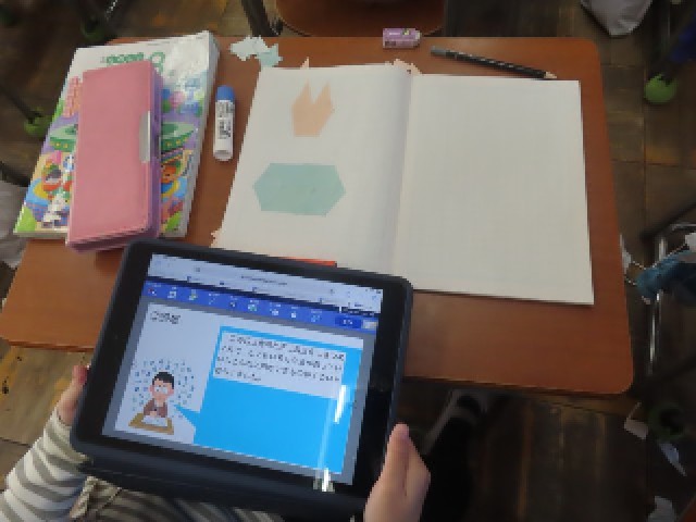 3年生は算数で「三角形と角」の学習を進めています。今日は、二等辺三角形や正三角形を敷き詰めていろいろな形をつくる活動に取り組んでいました。できあがった作品はタブレットで撮影し、友達と見せ合いながら楽しく交流していました。