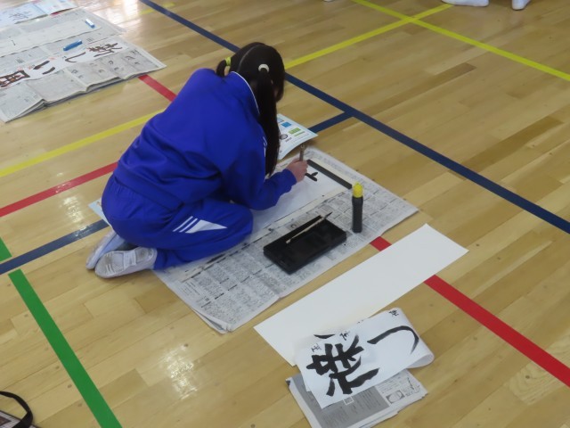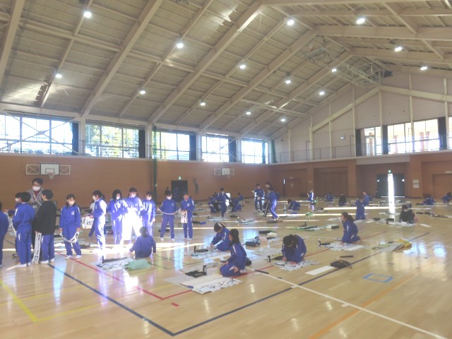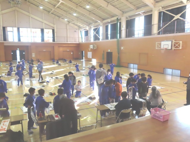 5年生が体育館で「新しい風」を題材に書き初めの練習をしていました。今日は講師の先生を3名お迎えし、筆の持ち方や字の形を整えるポイントなどを丁寧にご指導いただきました。子どもたちはアドバイスを受け、上手な字を書こうと集中して取り組んでいました。体育館には、真剣に筆を走らせる様子が広がっていました。