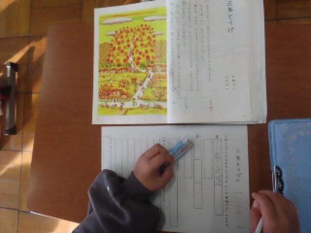 わかくさ学級の3年生が、国語の物語文「三年とうげ」の学習に取り組みました。ワークシートを活用しながら、物語の内容を丁寧に読み取り、登場人物の気持ちやお話の展開について考えていました。