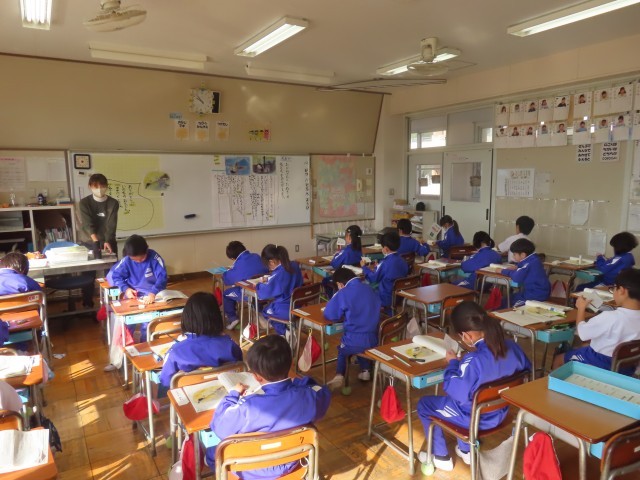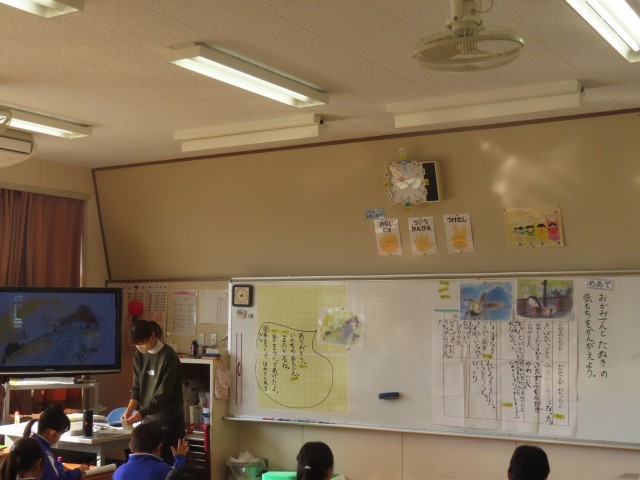 1年生は国語で物語文「たぬきの糸車」の学習に取り組んでいます。今日は、「おかみさん」と「たぬき」の気もちを想像し、吹き出しの紙に書いて教科書に貼り付けていました。子どもたちは登場人物の気もちを考えながら、ていねいに活動を進めていました。