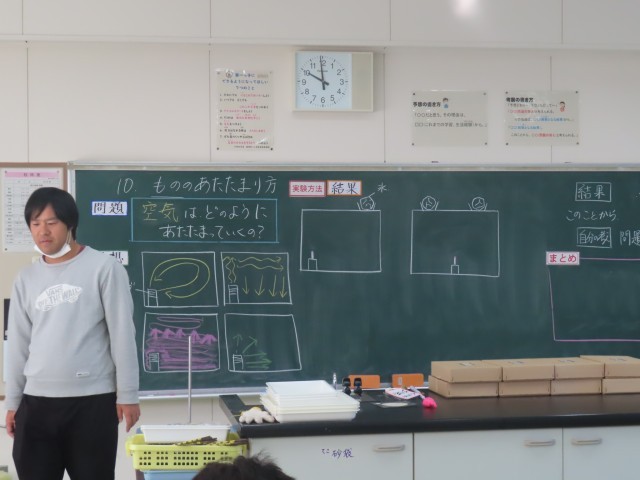 4年生は理科で「物のあたたまり方」の学習に取り組んでいます。今日は、空気のあたたまり方について実験を行いました。透明な箱の中で線香を焚き、煙がどのように動くのかを観察しながら、空気があたたまるとどのように動くのかを考えていました。
