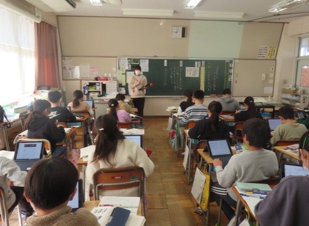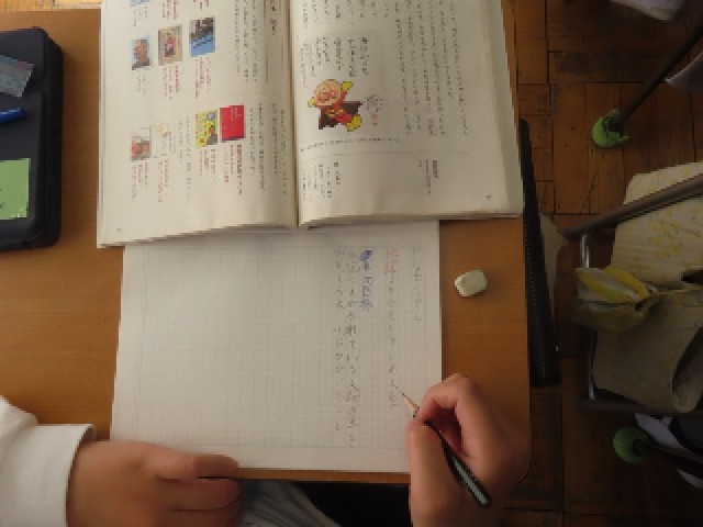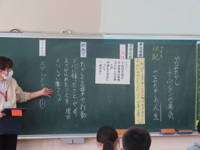 5年生は国語で「やなせたかし」の学習をしていました。この単元では、「伝記を読み、自分の生き方について考える」ことをめあてに学習を進めていきます。子どもたちは、誰もが知っているアンパンマンの作者であるやなせたかしさんの生き方に触れながら、どんな思いや考えを受け取るのか、真剣に読み進めていました。