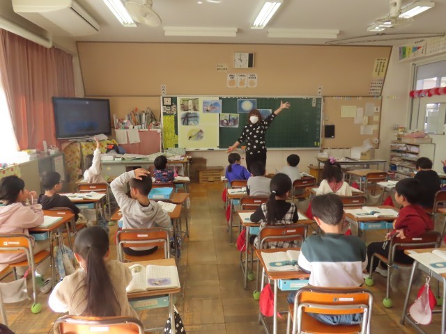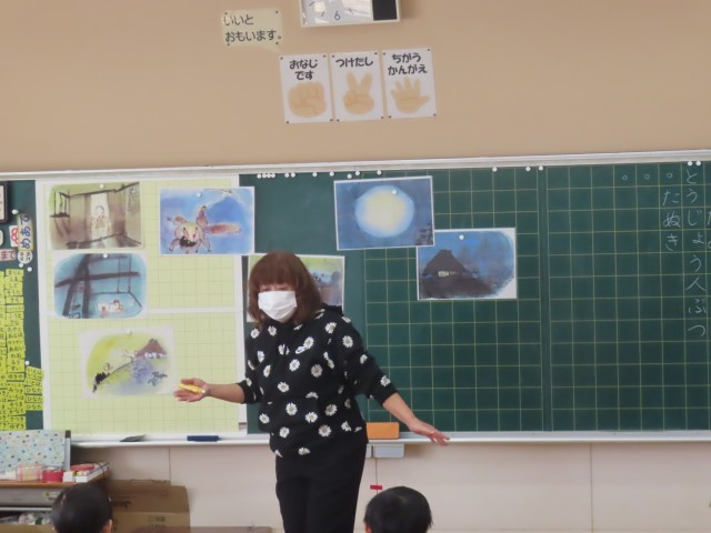 1年生の国語は物語文「たぬきの糸車」の学習をしています。今日は登場人物がどんな人たちかを確認する学習を行い、子どもたちは登場人物の名前や行動に注目しながら積極的に手を挙げて発言していました。楽しく学ぶ様子が感じられました。