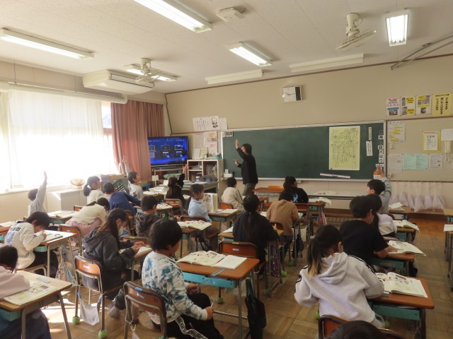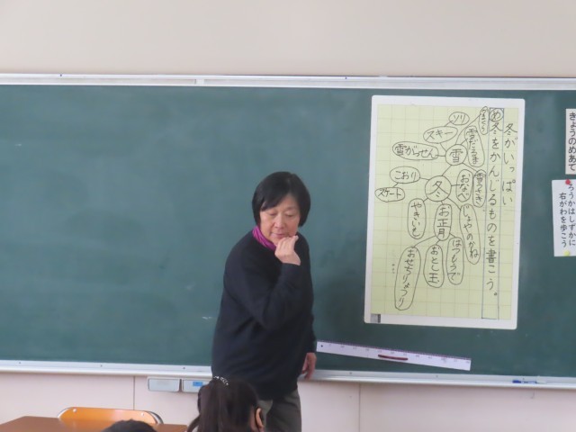 2年生は、国語で「冬がいっぱい」の学習に取り組んでいました。この学習では、冬に関する言葉を集め、その意味や使い方について理解を深めます。今日は、みんなで冬にまつわる言葉を発表し合い、たくさんの言葉を集めて楽しみながら学習していました。