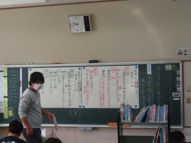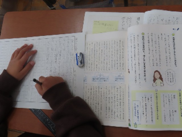 4年生の国語では、「もしものときにそなえよう」の学習に取り組んでいました。この日は、「理由や例を挙げて考えを伝える文章を書こう」というめあてのもと、自分で選んだ災害について調べたことを文章にまとめました。子どもたちは、調べた内容を整理しながら、読み手に分かりやすく伝えることを意識して、一生懸命に文章を書いていました。